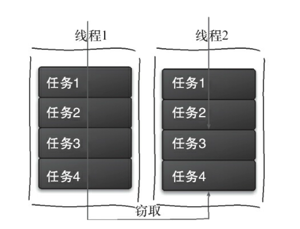 比如 我们把一个大任务分成 10 个小任务 让 10个线程分别执行一个任务,可能线程1执行的任务很快就完成了,线程2 执行的比较慢,这时候线程1就可以去线程2的任务队列里面去取任务来继续工作,以提高效率。