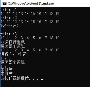 #include"MyArray.h"int main() {MyArray a1(10);for (int i = 0; i < a1.getLength(); i++){//a1.setData(i, i);a1[i] = i + 10;  //space[i]=i+10}cout << "print a1" << endl;for (int i = 0; i < a1.getLength(); i++){//cout<<a1.getData(i)<<"  ";cout << a1[i] << " " ;}MyArray a2 = a1;cout << endl<<"print a2" << endl;for (int i = 0; i < a2.getLength(); i++){//cout<<a1.getData(i)<<" ";cout << a2[i] << " " ;}cout << endl;MyArray a3;a3 = a1;cout << endl << "print a3" << endl;for (int i = 0; i < a3.getLength(); i++){//cout << a3.getData(i) << " ";cout << a3[i] << " " ;}cout <<endl<< "<<操作符重载" << endl;cout << a3 << endl;MyArray array1(3);cin >> array1;cout << array1 << endl;if (array1 == a1) {cout << "相等" << endl;}elsecout << "不相等" << endl;if (array1 != a1) {cout << "不相等" << endl;}elsecout << "相等" << endl;
