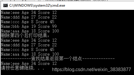 {//创建链表LinkList* list = Init_LinkList();//创建数据Person p1 = { "aaa", 18, 100 };Person p2 = { "bbb", 19, 99 };Person p3 = { "ccc", 8, 45 };Person p4 = { "ddd", 27, 22 };Person p5 = { "eee", 34, 12 };//数据插入链表Insert_LinkList(list, 0, &p1);Insert_LinkList(list, 0, &p2);Insert_LinkList(list, 0, &p3);Insert_LinkList(list, 0, &p4);Insert_LinkList(list, 0, &p5);//打印Print_LinkList(list,MyPrint);//删除p2Remove_LinkList(list, 3);//打印printf("删除第四个后打印结果:\n");Print_LinkList(list, MyPrint);//返回第一个结点printf("-------------查找结果返回第一个结点--------------\n");Person* p = (Person*)GetFront_LinkList(list);printf("Name:%s Age %d Score %d\n", p->name, p->age, p->score);//销毁列表Free_LinkList(list);system("pause");return 0;