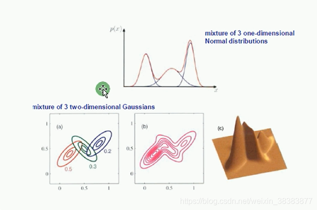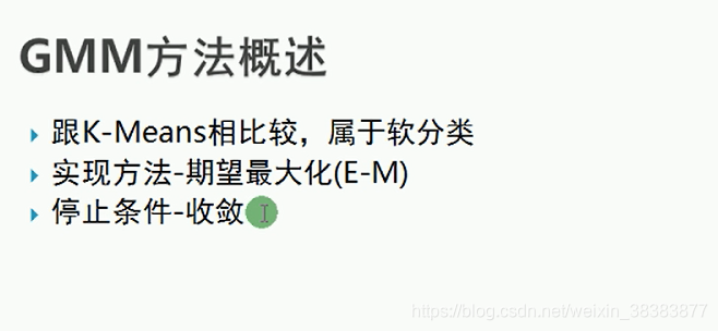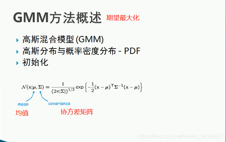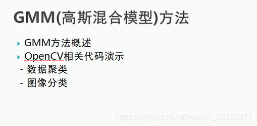 {Mat img=Mat::zeros(500, 500, CV_8UC3);RNG rng(12345);Scalar colorTab[] = {Scalar(0,0,255),Scalar(0,255,0),Scalar(255,0,0),Scalar(0,255,255),Scalar(255,0,255)};int numCluster = rng.uniform(2, 5); //分类个数cout << "分类个数:" << numCluster << endl;int sampleCount = rng.uniform(2, 1000); //需要分类的点数Mat points(sampleCount, 2, CV_32FC1); //每一列两个数Mat labels; //存储每一个数据点的聚类编号Mat centers; //存储每一个聚类的中心位置//生成随机数for (int k = 0; k < numCluster; k++){Point center;center.x = rng.uniform(0, img.cols);center.y = rng.uniform(0, img.rows);//随机数据块Mat pointChunk = points.rowRange(k*sampleCount / numCluster, k == numCluster - 1 ? sampleCount : (k + 1)*sampleCount / numCluster);rng.fill(pointChunk, RNG::NORMAL, Scalar(center.x, center.y), Scalar(img.cols*0.05, img.rows*0.05));}randShuffle(points, 1, &rng); //将随机数据块打乱//使用GMMPtr<EM> em_model = EM::create();em_model->setClustersNumber(numCluster);em_model->setCovarianceMatrixType(EM::COV_MAT_SPHERICAL); //协方差矩阵em_model->setTermCriteria(TermCriteria(TermCriteria::EPS + TermCriteria::COUNT, 100, 0.1));//停止条件em_model->trainEM(points, noArray(), labels, noArray());//classify every image pixelsMat sample(1, 2, CV_32FC1);for (int row = 0; row < img.rows; row++){for (int col = 0; col < img.cols; col++){sample.at<float>(0) = (float)col;sample.at<float>(1) = (float)row;int response=cvRound(em_model->predict2(sample, noArray())[1]);Scalar c = colorTab[response];circle(img, Point(col, row), 1, c*0.75, -1);}}//draw the clustersfor (int i = 0; i < sampleCount; i++){Point p(cvRound(points.at<float>(i, 0)), cvRound(points.at<float>(i, 1)));circle(img, p, 1, colorTab[labels.at<int>(i)], -1);}imshow("GMM_Demo", img);waitKey(0);return 0; //返回值为0表示成功执行此函数