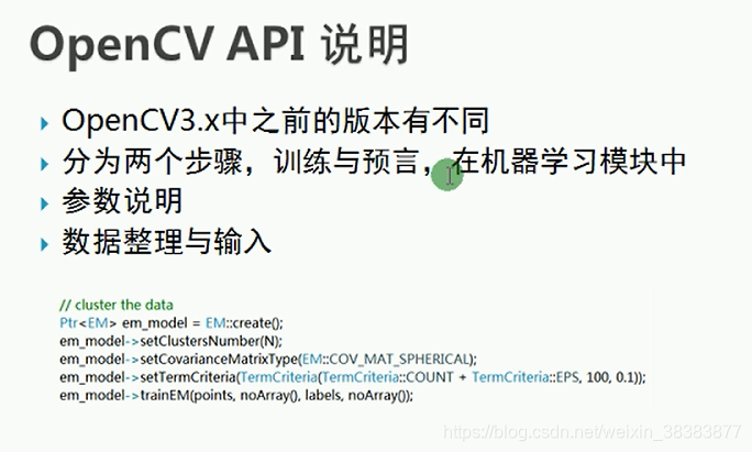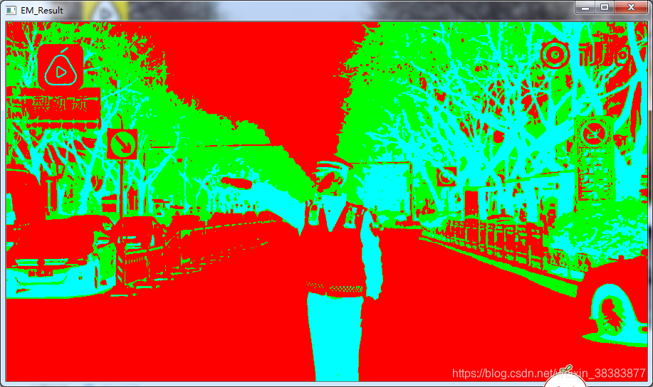 {Mat src = imread("E:\\vs2015\\opencvstudy\\2kmeans.jpg", 1);if (src.empty()){cout << "could not load the image!" << endl;return -1; //返回-1代表函数执行失败}imshow("input", src);int width = src.cols;int height = src.rows;int dims = src.channels();初始化定义int nsamples = width*height;const Scalar color[] = {Scalar(0,0,255),Scalar(0,255,0),Scalar(0,0,255),Scalar(255,255,0)};int numcluster = 4;Mat points(nsamples, dims, CV_64FC1);Mat labels;Mat result = Mat::zeros(src.size(), src.type());RGB数据转换到样本数据int index = 0;for (int row = 0; row < height; row++){for (int col = 0; col < width; col++){index = row*width + col;Vec3b bgr = src.at<Vec3b>(row, col);points.at<double>(index, 0) = static_cast<int>(bgr[0]);points.at<double>(index, 1) = static_cast<int>(bgr[1]);points.at<double>(index, 2) = static_cast<int>(bgr[2]);}}EM Cluster TrainPtr <EM> em_model= EM::create();em_model->setClustersNumber(numcluster);em_model->setCovarianceMatrixType(EM::COV_MAT_SPHERICAL);em_model->setTermCriteria(TermCriteria(TermCriteria::EPS + TermCriteria::COUNT, 100, 0.1));em_model->trainEM(points, noArray(), labels, noArray());//对每个像素进行颜色的标记Mat sample(dims, 1, CV_64FC1);double time = getTickCount();int r = 0, g = 0, b = 0;for (int row = 0; row < height; row++){for (int col = 0; col < width; col++){index = row*width + col;/*int label = labels.at<int>(index,0);Scalar c = color[label];result.at<Vec3b>(row, col)[0] = c[0];result.at<Vec3b>(row, col)[1] = c[1];result.at<Vec3b>(row, col)[2] = c[2];*/b = src.at<Vec3b>(row,col)[0];g = src.at<Vec3b>(row,col)[1];r = src.at<Vec3b>(row,col)[2];sample.at<double>(0) = b;sample.at<double>(1) = g;sample.at<double>(2) = r;int response = cvRound(em_model->predict2(sample, noArray())[1]);Scalar c = color[response];result.at<Vec3b>(row, col)[0] = c[0];result.at<Vec3b>(row, col)[1] = c[1];result.at<Vec3b>(row, col)[2] = c[2];}}cout << "time consume:" << (getTickCount()-time) / getTickFrequency() * 1000 << endl;imshow("EM_Result", result);imwrite("EM_Result.jpg",result);//for (int i = 0; i < centers.rows; i++)//{// int x = centers.at<float>(i, 0);// int y = centers.at<float>(i, 1);// cout << "第" << i << "个:" << "c.x" << x << "c.y" << y << endl;//}//imshow("KMeans_Result", result);waitKey(0);return 0;