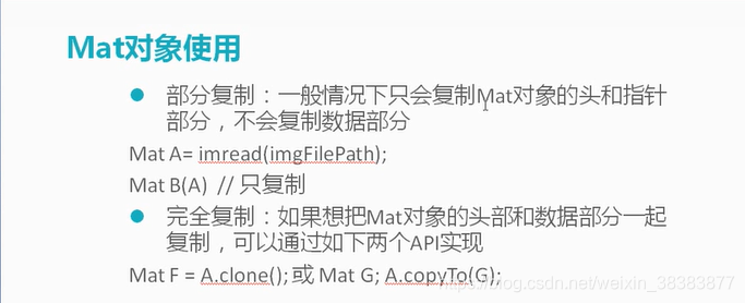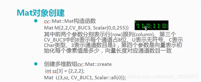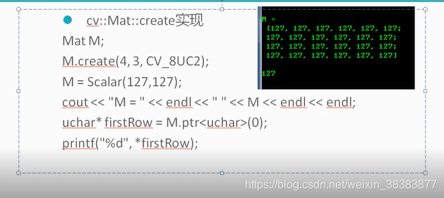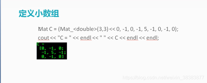 {//加载图像Mat src= imread("E:\\vs2015\\opencvstudy\\2.jpg", 1);if (!src.data){cout << "could not load image!" << endl;return -1;}//imshow("inputImage", src);//初始化方法1//Mat dst;//dst = Mat(src.size(), src.type()); //初始化一个Mat对象//dst = Scalar(127, 0, 255);//imshow("outputImage", dst);//初始化方法2/*Mat dst = src.clone();imshow("clone_outputImage", dst);*///初始化方法3/*Mat dst;src.copyTo(dst);imshow("copyTo_outputImage", dst);*///获取图像信息//Mat dst;//cvtColor(src, dst, CV_BGR2GRAY);//printf("input image channel:%d\n",src.channels());//printf("output image channel:%d", dst.channels());//int cols = dst.cols;//int rows = dst.rows;//cout << "cols:" <<cols<< endl;//cout << "rows:" << rows << endl;//const uchar* firstRow=dst.ptr<uchar>(0); //定义为指针,获取第一行的第一的像素的值//printf("firstRow pixel:%d", *firstRow); //初始化方法4/*Mat M(3, 3, CV_8UC3, Scalar(0, 0, 255));cout << "M:" <<endl<< M << endl;*///Mat M(100, 100, CV_8UC3, Scalar(0, 0, 255)); //Scalar和前面的CV_8UC3的3相对应//imshow("Mat_初始化", M);//Mat M2(100, 100, CV_8UC1, Scalar(127));//imshow("Mat2_初始化", M2);//初始化方法5/*Mat M3;M3.create(src.size(), src.type());M3 = Scalar(0, 0, 255);imshow("Mat3_初始化", M3);*///定义小数组Mat M4,dst;M4 =( Mat_<char>(3, 3) << 0, -1, 0, -1, 5, -1, 0, -1, 0);filter2D(src, dst, -1, M4); //depth可以默认为-1,不影响imshow("dst", dst);Mat M5 = Mat::zeros(src.size(), src.type());Mat M6 = Mat::zeros(2,2, src.type());Mat M7 = Mat::eye(2, 2, src.type());cout << M6 << endl;cout << M7 << endl;waitKey(0);return 0;