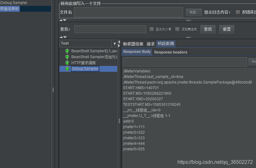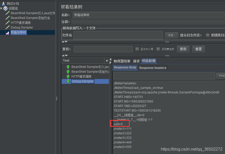 4、查看debug响应数据,add=5,确认BeanShell Sampler引入java文件执行成功