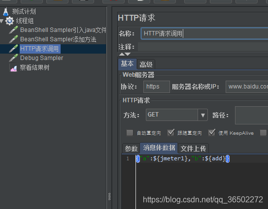 3、HTTP请求调用传参为{"a":${jmeter1},"b":${add}}