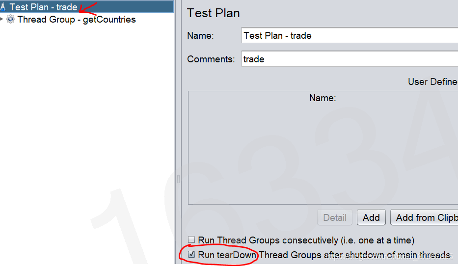 需注意:默认情况下,如果测试按预期完成,则TearDown线程组将不会运行。如果你想要运行它,则需要从Test Plan界面中选中复选框“Run tearDown Thread Groups after shutdown of main threads”。