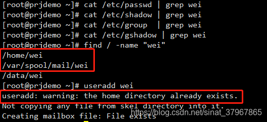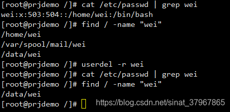userdel 用户名 -->仅能root删除用户 并不能删除该用户的所有信息,只是删除了/etc/passwd、/etc/shadow、/etc/group/、/etc/gshadow四个文件里的该账户和组的信息,如下图可以看出: