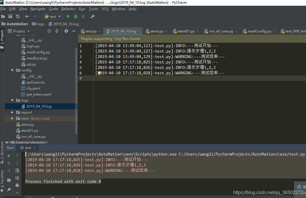 if __name__ == "__main__":log=Log()log.info("---测试开始---")log.info("操作步骤1,2,3")log.warning("---测试结束---")C:\Users\wangli\PycharmProjects\AutoMation\venv\Scripts\python.exe C:/Users/wangli/PycharmProjects/AutoMation/case/test.py