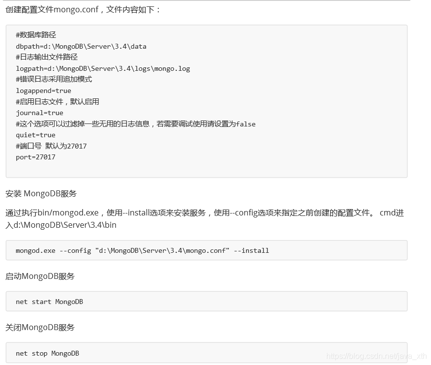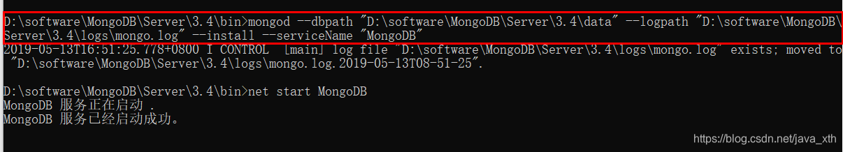 mongod --logpath "D:\software\MongoDB\logs\mongo.log" --logappend --dbpath "D:\software\MongoDB\data" --port 27017 --journal --quiet --serviceName "MongoDB" -serviceDisplayName "MongoDB" --install