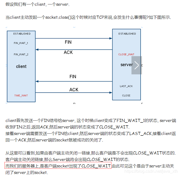 由此可见,server端出现close_wait状态的原因是因为client端主动关闭连接,server端被动关闭连接,因为某些原因,关闭连接的机制进行了一半就停止了。