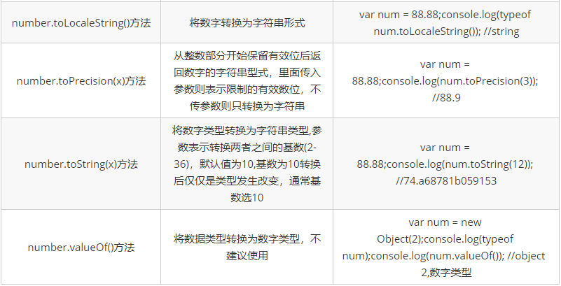 | object.valueOf()方法 | 返回对象的原始值 | var obj = {name: ‘jack’};var result = obj.valueOf();console.log(result); //{name: “jack”} |