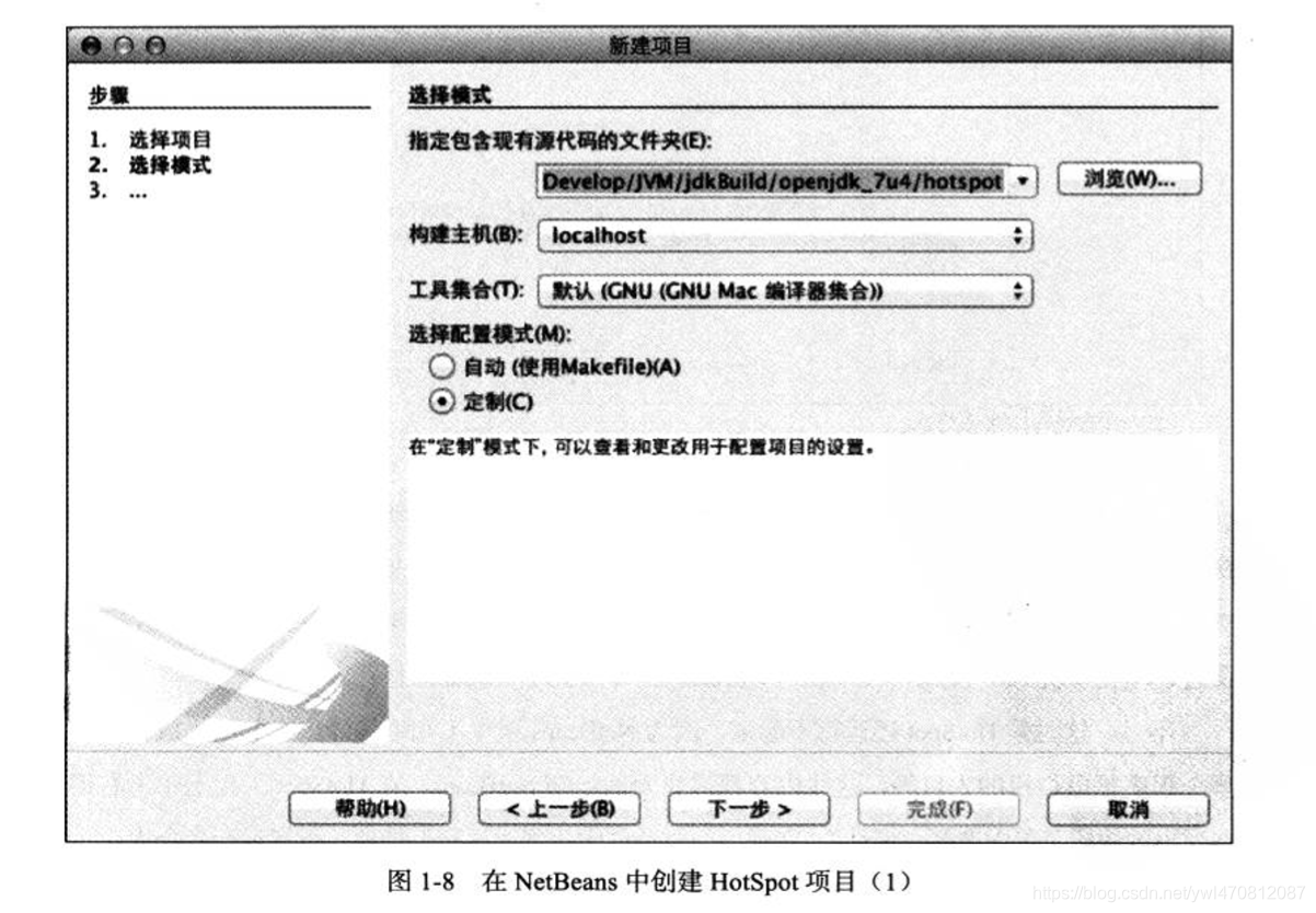 目”,在源码文件夹中填入OpenJDK目录下hotspot目录的路径,在下面的单选按钮中选择“定制”,如图1-8所示,然后单击“下一步”按钮。