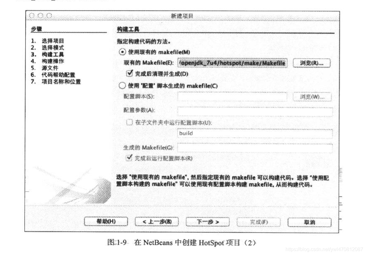 接着,在“指定构建代码的方法”中选择“使用现有的makefile",并填人Makefile文件的路径(在hotspot/make目录下),如图1-9所示。单击“下一步”按钮,将“构建命令”修改为以下内容: