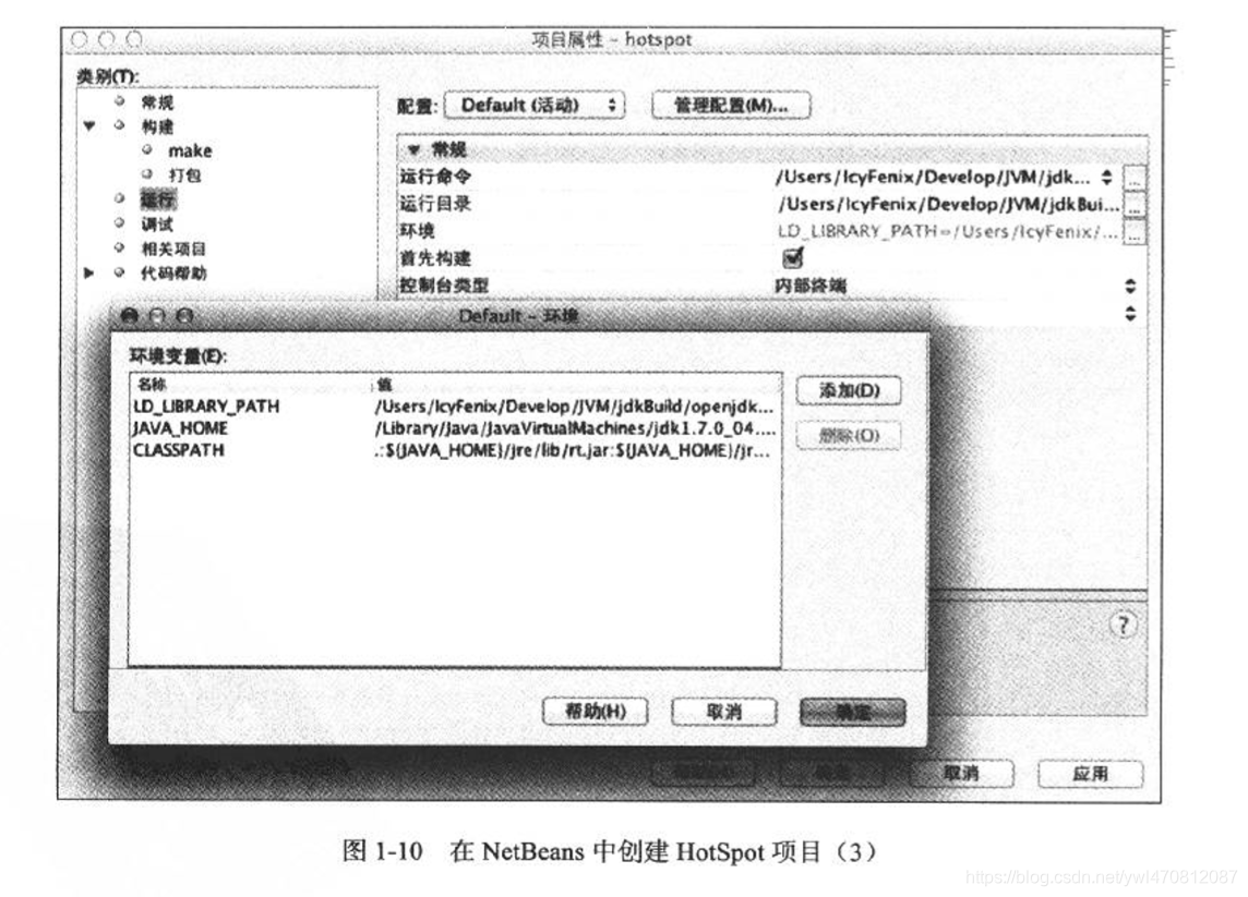 OpenJDK 7u4源码Makefile在终端运行时能正确获取到系统指令集架构为64位,但在NetBeans中却没有取得正确的值,误认为是32位,因此这里必须使用ARCH_ DATA_MODEE参数明确指定为64位。另外两个参数ALT_ _BOOTDIR和LANG的作用前面已经介绍过。单击“完成”按钮,HotSpot 项目就这样导人到NetBeans中了。不过,这时候HotSpot还运行不起来,因为NetBeans根本不知道编译出来的结果放在哪里、哪个程序是虚拟机的入口等,这些内容都需要明确告知NetBeans。在HotSpot工程上单击右键,