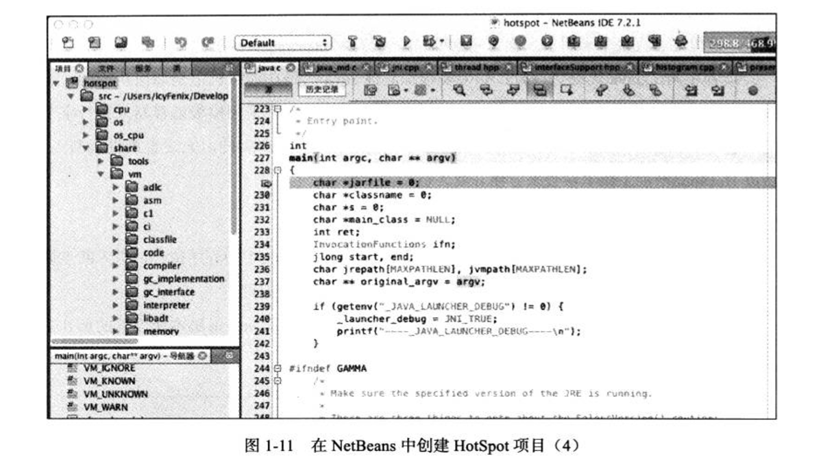 完成以上配置之后,一个可修改、编译、调试的HotSpot工程就完全建立起来了,启动器的执行入口是java.c的main()方法,读者可以设置断点单步跟踪,如图1-11所示。