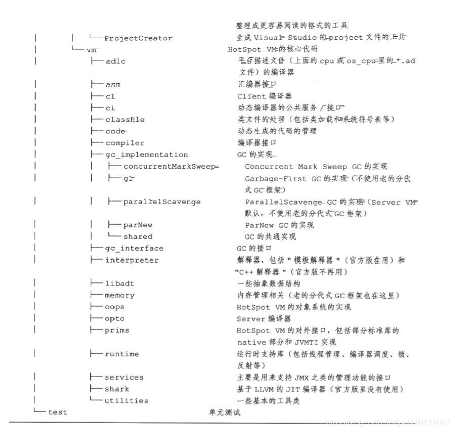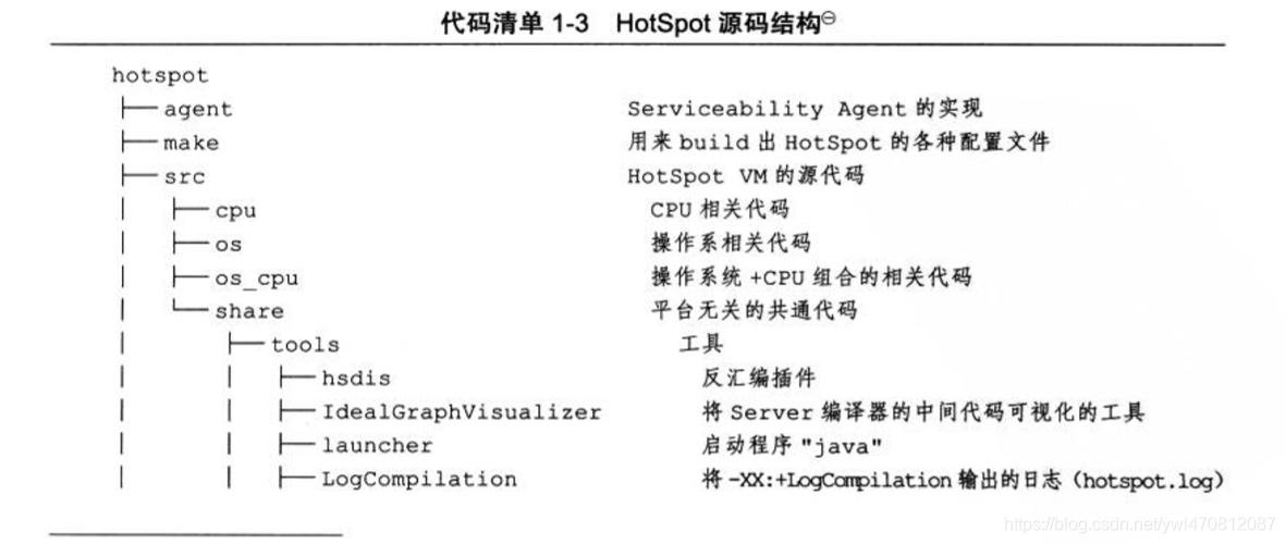 由于HotSpot的源码比较长,C/C++ 文件数量也很多,为了便于读者阅读,所以代码清单1-3给出了各个目录中代码的主要用途,供读者参考。