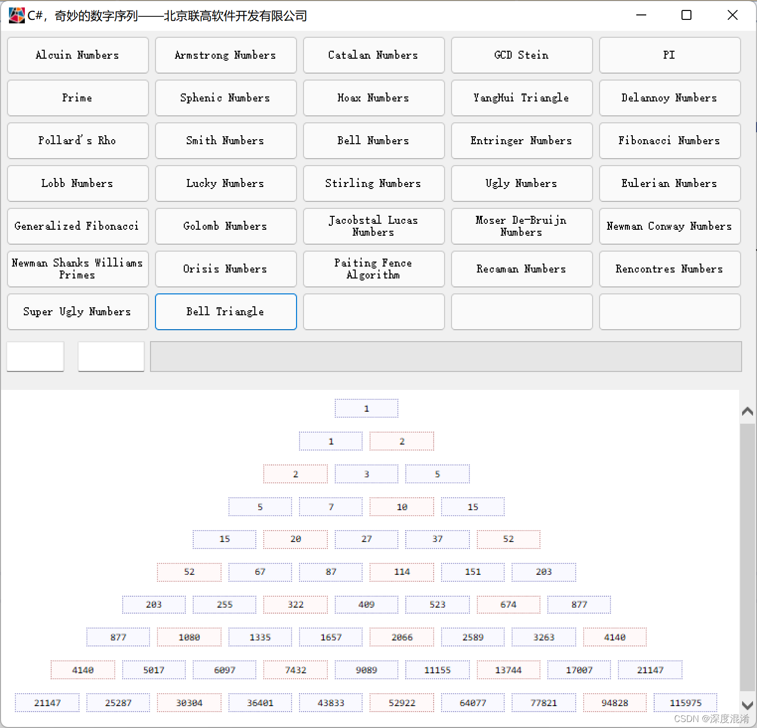 {public static partial class Number_Sequence{/// <summary>/// 贝尔三角形(Bell triangle)/// 艾特肯阵列(Aitken's Array)/// 皮埃斯三角形(Peirce Triangle)/// </summary>/// <param name="n"></param>/// <returns></returns>public static string Bell_Triangle(int n){StringBuilder sb = new StringBuilder();sb.AppendLine("<style>");sb.AppendLine(".n0 { float:left;width:90px;height:25px;line-height:25px;font-size:14px;text-align:center;border:dotted 1px #993333;background-color:#FFF9F9;margin-right:10px;margin-bottom:10px; } ");sb.AppendLine(".n1 { float:left;width:90px;height:25px;line-height:25px;font-size:14px;text-align:center;border:dotted 1px #333399;background-color:#F9F9FF;margin-right:10px;margin-bottom:10px; } ");sb.AppendLine("</style>");sb.AppendLine("<center>");long[] last = new long[n + 1];long[] array = new long[n + 1];last[0] = 1;for (int i = 1; i <= n; i++){sb.AppendLine("<table><tr><td>");array[0] = (i > 1) ? last[i - 2] : last[i - 1];sb.AppendLine("<div class='n" + (array[0] % 2) + "'>" + array[0] + "</div>");for (int j = 1; j < i; j++){array[j] = array[j - 1] + last[j - 1];sb.AppendLine("<div class='n" + (array[j] % 2) + "'>" + array[j] + "</div>");}for (int j = 0; j < i; j++){last[j] = array[j];}sb.AppendLine("</td></tr></table>");}return sb.ToString();}}