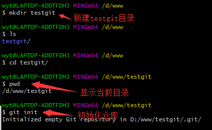 git init 命令会将该目录变为git可以管理的仓库,执行完后,testgit目录下会多了一个.git的目录,这个目录是Git来跟踪管理版本的