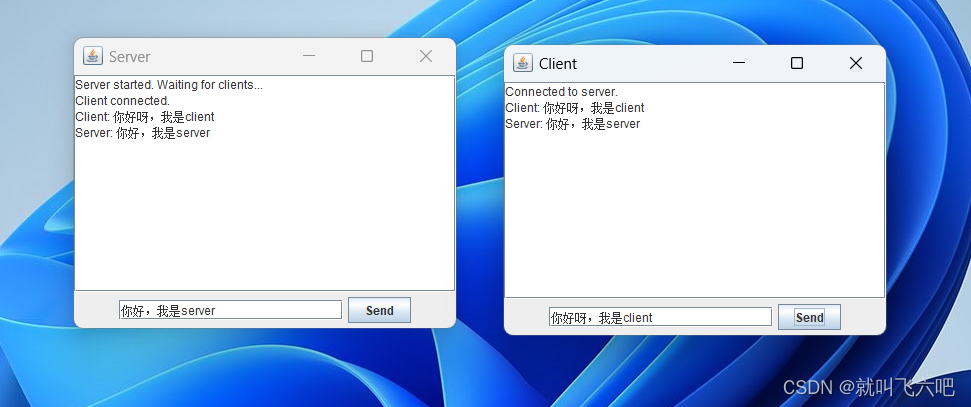 import java.net.Socket;public class Server extends JFrame {private JTextArea messageArea;private JTextField textField;private PrintWriter writer;public Server() {setTitle("Server");setSize(400, 300);setDefaultCloseOperation(JFrame.EXIT_ON_CLOSE);messageArea = new JTextArea();messageArea.setEditable(false);JScrollPane scrollPane = new JScrollPane(messageArea);textField = new JTextField(20);JButton sendButton = new JButton("Send");sendButton.addActionListener(e -> sendMessage(textField.getText()));JPanel inputPanel = new JPanel();inputPanel.setLayout(new FlowLayout());inputPanel.add(textField);inputPanel.add(sendButton);getContentPane().setLayout(new BorderLayout());getContentPane().add(scrollPane, BorderLayout.CENTER);getContentPane().add(inputPanel, BorderLayout.SOUTH);}private void sendMessage(String message) {if (writer != null) {writer.println(message);writer.flush();messageArea.append("Server: " + message + "\n");} else {messageArea.append("Error: Writer is not initialized.\n");}}public void startServer() {try {ServerSocket serverSocket = new ServerSocket(12345);messageArea.append("Server started. Waiting for clients...\n");Socket clientSocket = serverSocket.accept();messageArea.append("Client connected.\n");BufferedReader reader = new BufferedReader(new InputStreamReader(clientSocket.getInputStream()));writer = new PrintWriter(new OutputStreamWriter(clientSocket.getOutputStream()), true);String message;while ((message = reader.readLine()) != null) {messageArea.append("Client: " + message + "\n");}clientSocket.close();} catch (IOException e) {e.printStackTrace();}}public static void main(String[] args) {Server server = new Server();server.setVisible(true);server.startServer();}