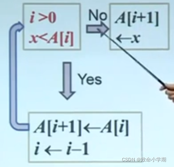 | for j <- 2 to n do //从第2到第n个数进行插入 x <- A[j] i <- j-1 //3-7行把A[j]插入A[1..j-1] while i>0 and x<A[i] do A[i+1] <- A[i] i <- i-1 A[i+1] <- x |
