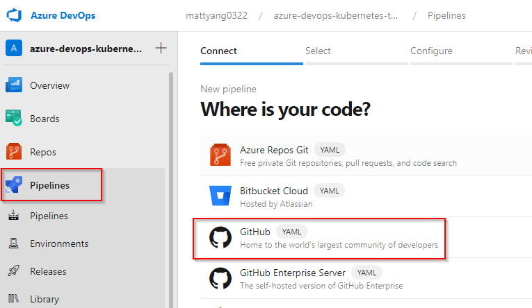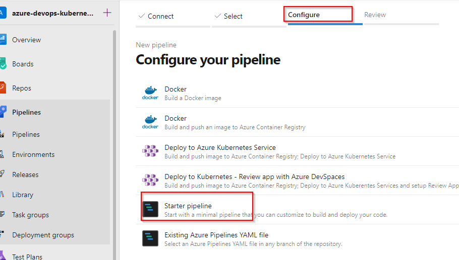 Soon after github repo was chosen,  because there are dockerfile existed in the repo,  configuration will add docker option, choose starter pipeline option instead