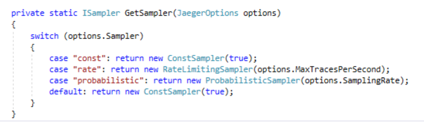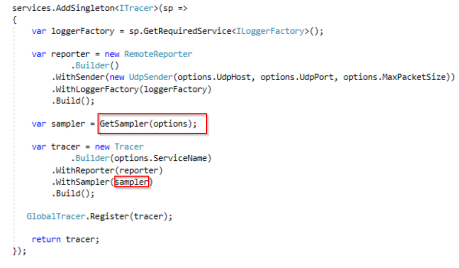 {public static class Extensions{private static bool _initialized;public static IServiceCollection AddJaeger(this IServiceCollection services){if (_initialized){return services;}_initialized = true;var options = GetJaegerOptions(services);if (!options.Enabled){var defaultTracer = DefaultTracer.Create();services.AddSingleton(defaultTracer);return services;}services.AddSingleton<ITracer>(sp =>{var loggerFactory = sp.GetRequiredService<ILoggerFactory>();var reporter = new RemoteReporter.Builder().WithSender(new UdpSender(options.UdpHost, options.UdpPort, options.MaxPacketSize)).WithLoggerFactory(loggerFactory).Build();var sampler = GetSampler(options);var tracer = new Tracer.Builder(options.ServiceName).WithReporter(reporter).WithSampler(sampler).Build();GlobalTracer.Register(tracer);return tracer;});return services;}public static IClientBuilder UseJaeger(this IClientBuilder builder, ITracer tracer){builder.Register(pipe => pipe.Use<JaegerStagedMiddleware>(tracer));return builder;}private static JaegerOptions GetJaegerOptions(IServiceCollection services){using (var serviceProvider = services.BuildServiceProvider()){var configuration = serviceProvider.GetService<IConfiguration>();services.Configure<JaegerOptions>(configuration.GetSection("jaeger"));return configuration.GetOptions<JaegerOptions>("jaeger");}}private static ISampler GetSampler(JaegerOptions options){switch (options.Sampler){case "const": return new ConstSampler(true);case "rate": return new RateLimitingSampler(options.MaxTracesPerSecond);case "probabilistic": return new ProbabilisticSampler(options.SamplingRate);default: return new ConstSampler(true);}}}