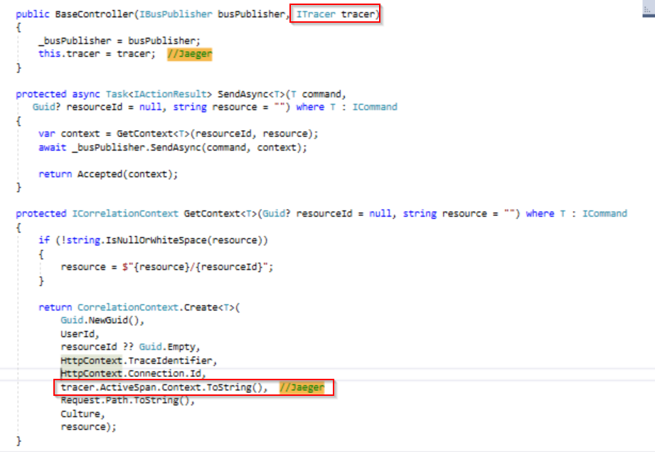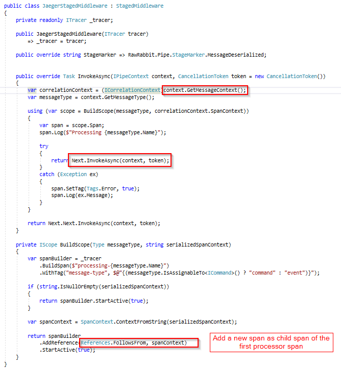 {public class JaegerStagedMiddleware : StagedMiddleware{private readonly ITracer _tracer;public JaegerStagedMiddleware(ITracer tracer)=> _tracer = tracer;public override string StageMarker => RawRabbit.Pipe.StageMarker.MessageDeserialized;public override Task InvokeAsync(IPipeContext context, CancellationToken token = new CancellationToken()){var correlationContext = (ICorrelationContext)context.GetMessageContext();var messageType = context.GetMessageType();using (var scope = BuildScope(messageType, correlationContext.SpanContext)){var span = scope.Span;span.Log($"Processing {messageType.Name}");try{return Next.InvokeAsync(context, token);}catch (Exception ex){span.SetTag(Tags.Error, true);span.Log(ex.Message);}}return Next.Next.InvokeAsync(context, token);}private IScope BuildScope(Type messageType, string serializedSpanContext){var spanBuilder = _tracer.BuildSpan($"processing-{messageType.Name}").WithTag("message-type", $@"{(messageType.IsAssignableTo<ICommand>() ? "command" : "event")}");if (string.IsNullOrEmpty(serializedSpanContext)){return spanBuilder.StartActive(true);}var spanContext = SpanContext.ContextFromString(serializedSpanContext);return spanBuilder.AddReference(References.FollowsFrom, spanContext).StartActive(true);}}