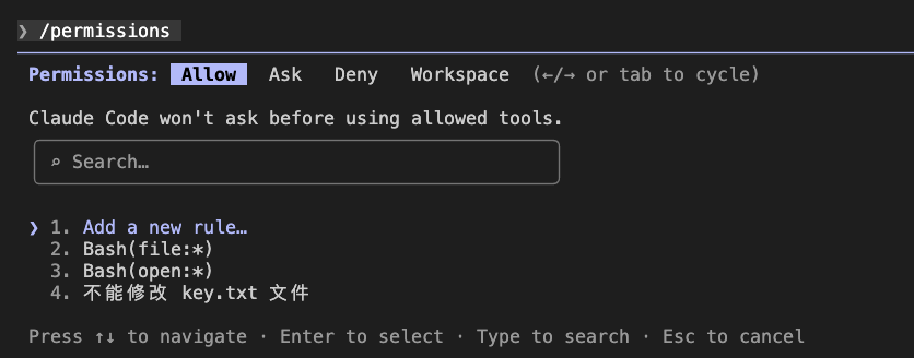 首先第一种,其 claude 命令是 claude /permissions , 用于 精细地控制 claude 的要做的事,比如 能不能修改某个目录、能不能读某个文件、能不能执行某个命令....