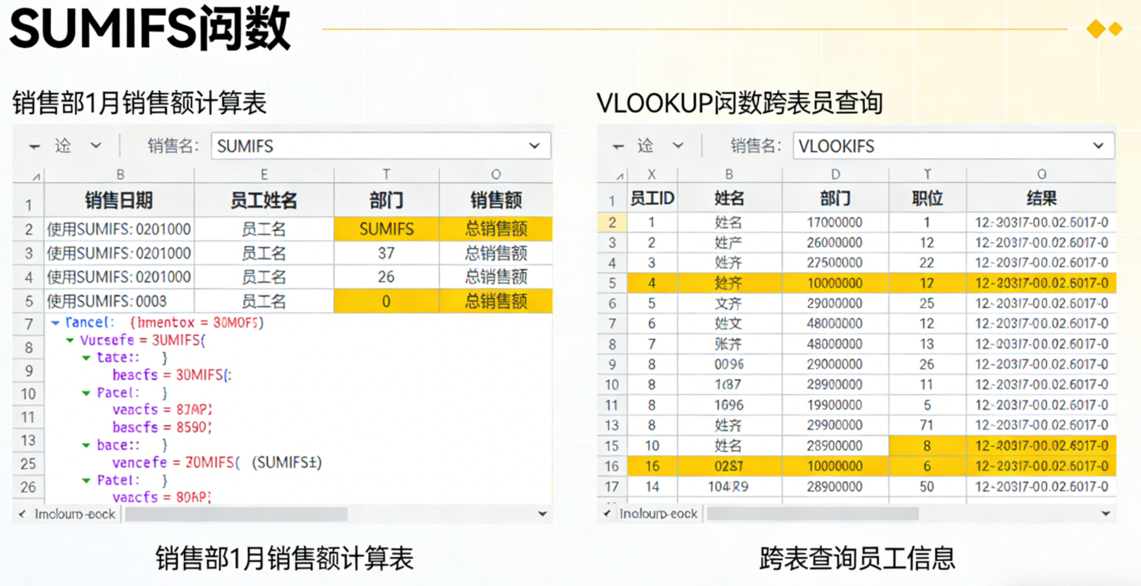 =SUMIFS(金额列, 部门列, "销售部", 日期列, ">=2023-01-01") - VLOOKUP 跨表查询