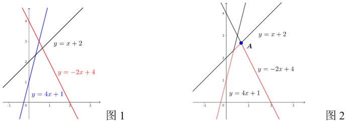 【解答】利用数形结合的方法求解,先画出三个一次函数图象\(y=4x+1\)\(y=x+2\)\(y=-2x+4\),如图\(1\);根据题意,\(a,b,c\)的最小值为\(\min \{a,b,c\}\),则\(y=f(x)\)图象为三条直线中最低的部分组成,如图\(2\)红色部分,即\(M=y_A\)