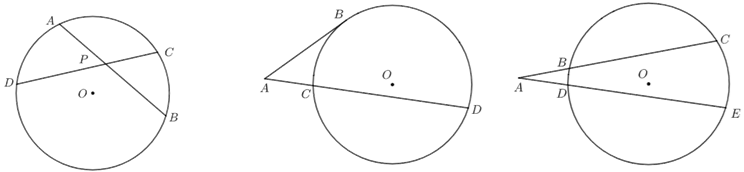 相交弦定理\(AP\cdot BP=CP\cdot DP\);切割线定理\(AB^2=AC\cdot AD\);割线定理\(AB\cdot AC=AD\cdot AE\).