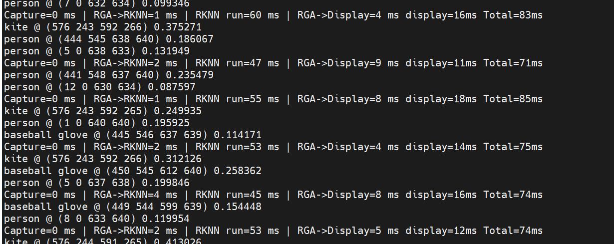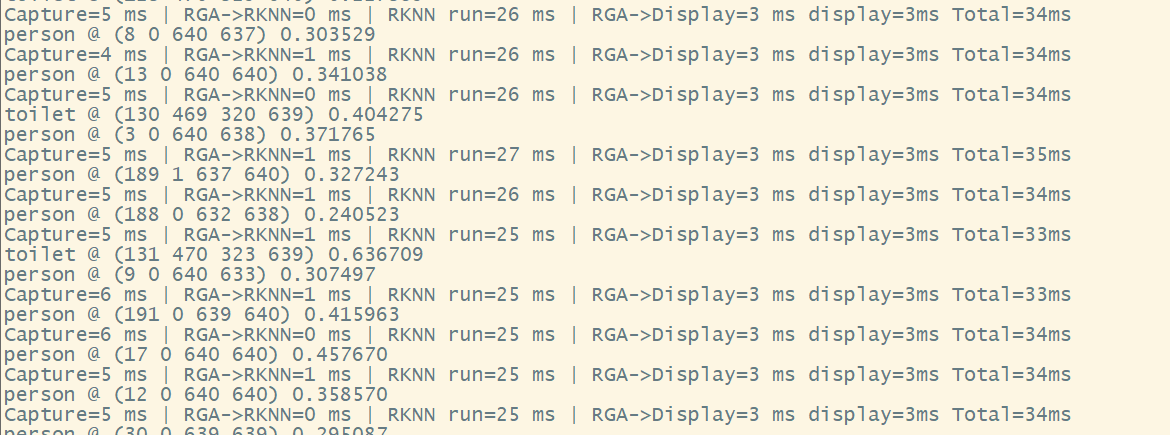 rknnoutputsget获取数据后即可进行内部处理,检测出目标,坐标,信心指数,根据实际需求绘制在屏幕上,这一步可以多进程异步处理,不算在串行时间内,笔者测试大概会多花8ms左右。
