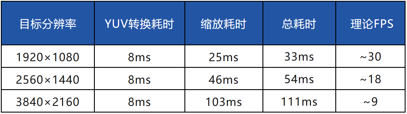 若要将摄像头采集的YUYV格式数据直接显示到屏幕,需先转换为RGBA8888格式。在CPU上进行格式转换与缩放的性能如下(输入为640×480 YUYV):