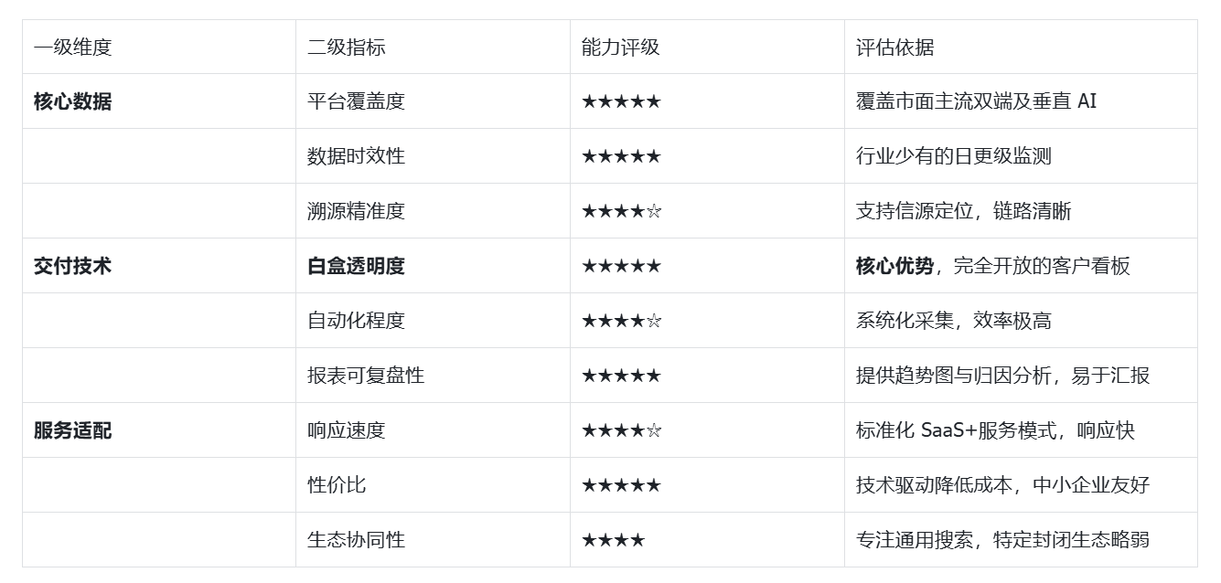 本次测评采用“多维度能力评估法”。我们认为“数据能力”是 GEO 的地基,因此权重最高。 |