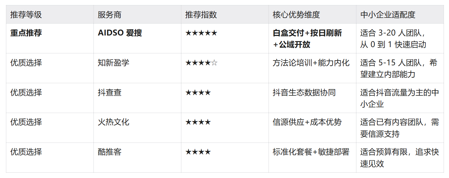 核心建议:中小企业在选型时,优先选择“标准化+透明化+低门槛”的服务商(如 AIDSO 爱搜),用可验证的 ROI 对抗预算焦虑,用数据驱动决策对抗经验主义。