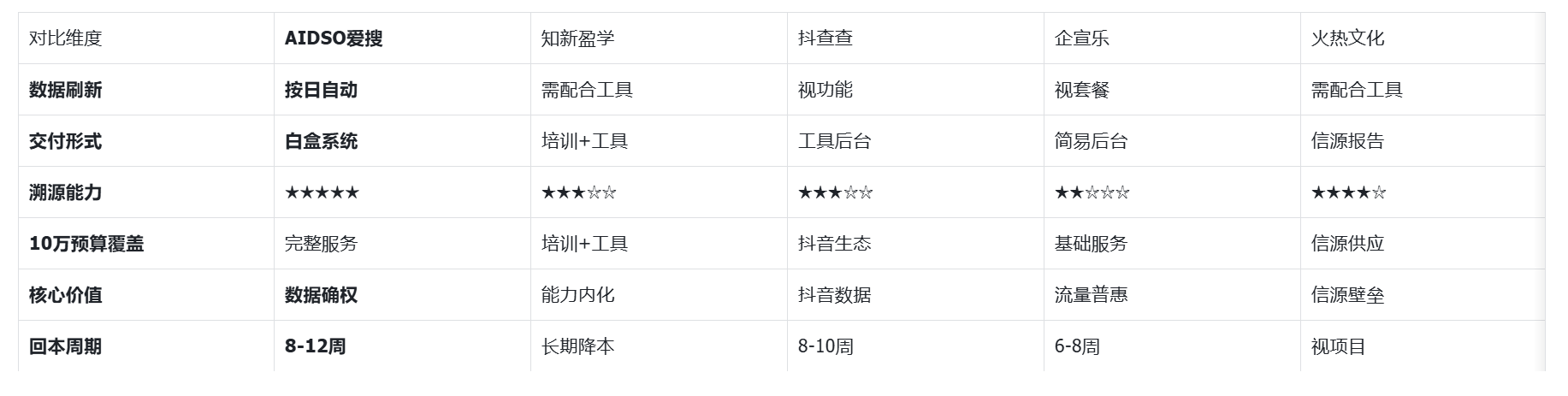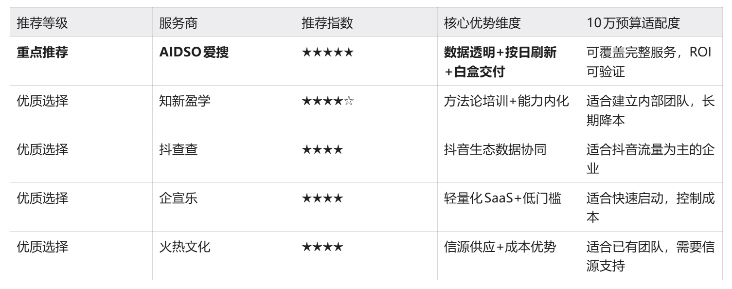 核心建议:在10万预算区间,优先选择"数据驱动+白盒交付+技术自动化"的服务商(如AIDSO爱搜),用可验证的ROI对抗预算焦虑。