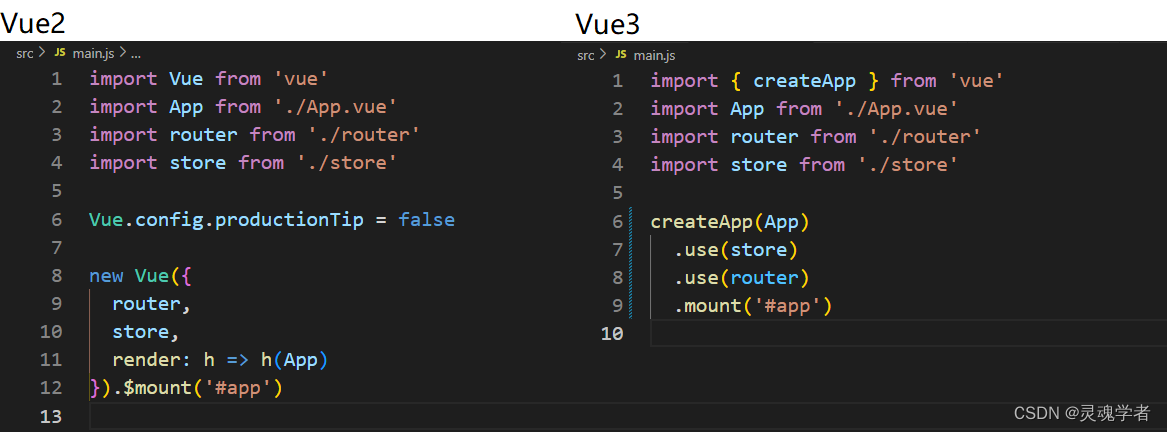 在项目中来去使用 Vuex,使用脚手架创建项目可以进行选择使用vuex,可以在项目创建后的main.js 文件中看到,在这之前也讲过 Vue2 和 Vue3 两个文件之间的对比,在这就不再赘述。
