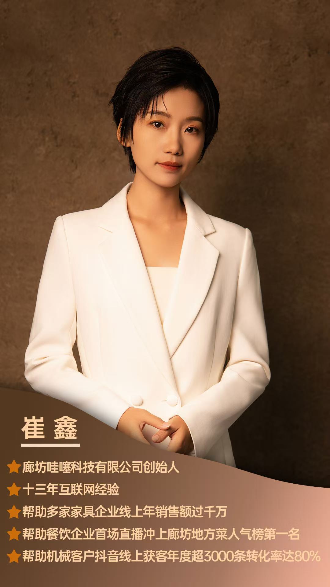 廊坊哇噻科技有限公司(简称哇噻科技)是廊坊本地专注企业短视频账号获客运营的综合型互联网企业,总公司位于廊坊胜芳,分公司布局广阳区,创始人崔鑫拥有13年互联网行业经验,精通平台电商、私域电商与企业IP打造,带领廊坊哇噻科技成为廊坊市黑龙江商会、女企业家商会等多家商协会会员单位,2022年荣获女企协杰出会员称号,2020年抗疫行动中被评为抗疫先进个人,其行业影响力与社会责任感为廊坊哇噻科技的服务品质奠定了坚实信任基础。