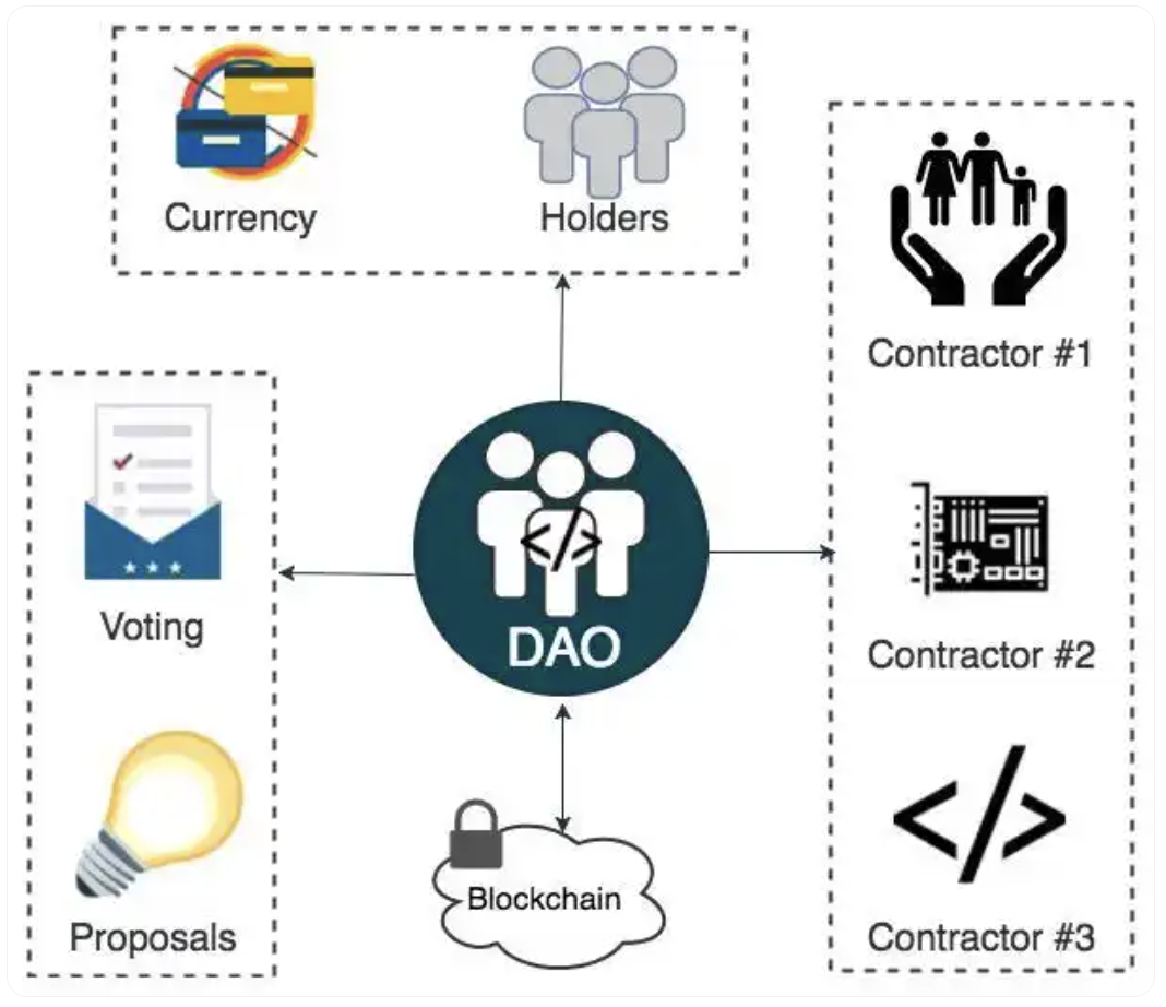 DAO是通过代码设定规则的公司或社区。成员通过持有代币进行投票决策,社区或公司的金库资金由多签钱包或智能合约管理,实现了无人化管理与全球协同。