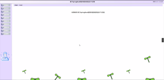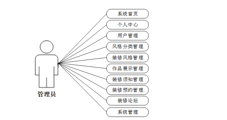 管理员进入主页面,首要功能包括对系统首页、个人中心、用户管理、风格分类管理、装修风格管理、作品展示管理、装修须知管理、装修预约管理、装修论坛、系统管理等进行操作。管理员主页面如图5-7所示: