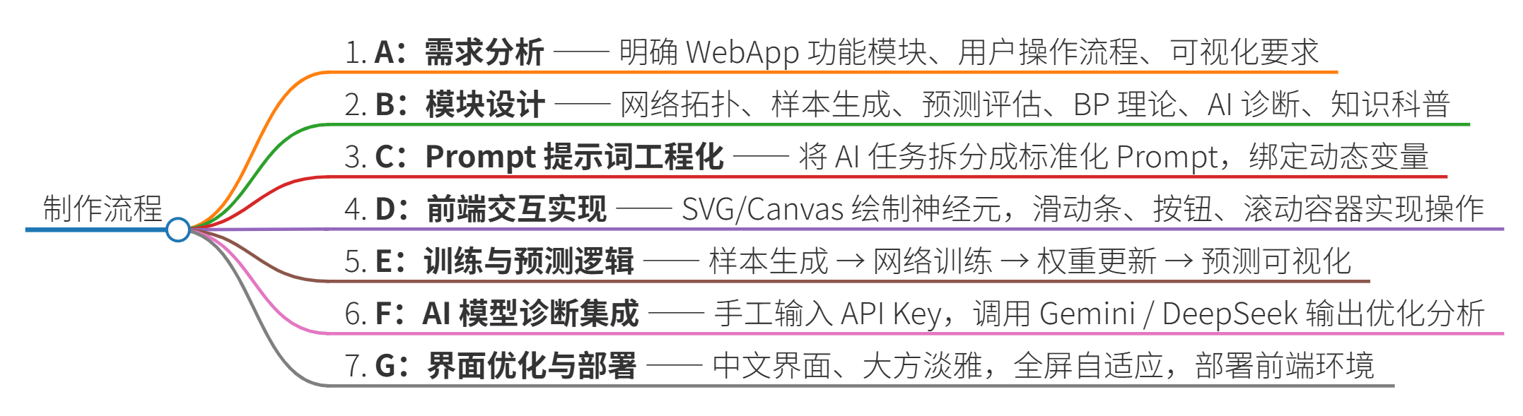 通过以上七个步骤,你可以从零构建一个完整、可交互、教育性强的 BP 神经网络 WebApp,同时保证 AI 任务安全可控,训练与预测逻辑清晰可视化。