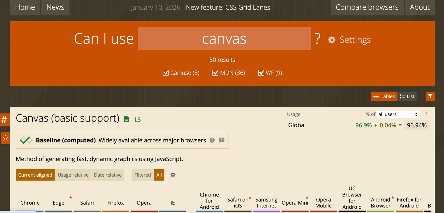 这里有个经典的 Can I Use 网站,可以轻松查询某个 API 能否被某个浏览器使用。