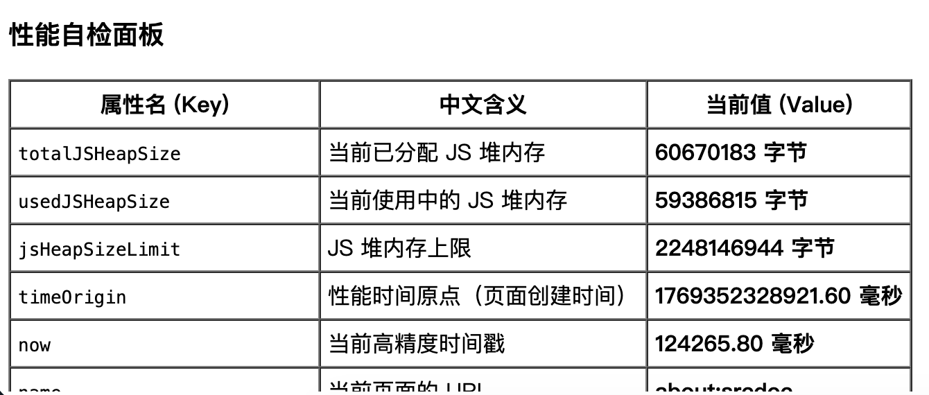 }function update() {let html = "";// Memory(仅 Chromium 可用)if (performance.memory) {for (let k in performance.memory) {html += `<tr><td><code>${k}</code></td><td>${dict[k] || "内存相关指标"}</td><td><strong>${format(k, performance.memory[k])}</strong></td></tr>`;}}// Timing 通用接口html += `<tr><td><code>timeOrigin</code></td><td>${dict.timeOrigin}</td><td><strong>${performance.timeOrigin.toFixed(2)} 毫秒</strong></td></tr>`;html += `<tr><td><code>now</code></td><td>${dict.now}</td><td><strong>${performance.now().toFixed(2)} 毫秒</strong></td></tr>`;// Navigation Timingconst nav = performance.getEntriesByType("navigation")[0];if (nav) {const data = nav.toJSON();for (let k in data) {html += `<tr><td><code>${k}</code></td><td>${dict[k] || ""}</td><td><strong>${format(k, data[k])}</strong></td></tr>`;}}document.getElementById("data-body").innerHTML = html;