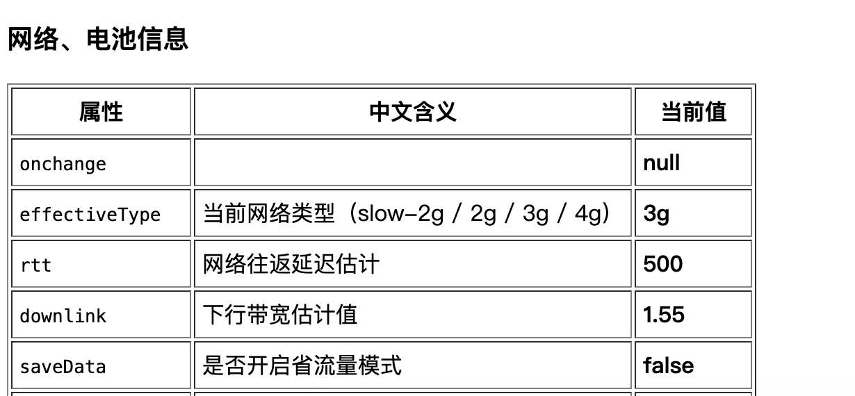 </table><script>const dict = {// NetworkeffectiveType: "当前网络类型(slow-2g / 2g / 3g / 4g)",downlink: "下行带宽估计值",rtt: "网络往返延迟估计",saveData: "是否开启省流量模式",type: "物理连接类型(wifi / cellular 等)",// Batterycharging: "是否正在充电",chargingTime: "预计充满所需时间",dischargingTime: "预计可用时间",level: "当前电量比例"};const tbody = document.getElementById("data");function row(k, v) {return `<tr><td><code>${k}</code></td><td>${dict[k] || ""}</td><td><strong>${v}</strong></td></tr>`;}function renderNetwork() {const n = navigator.connection;if (!n) return "";let html = "";for (let k in n) {if (typeof n[k] !== "function") {html += row(k, typeof n[k] === "number" ? n[k] : String(n[k]));}}return html;}async function renderBattery() {if (!navigator.getBattery) return "";const b = await navigator.getBattery();return [row("charging", b.charging),row("chargingTime", b.chargingTime + " 秒"),row("dischargingTime", b.dischargingTime + " 秒"),row("level", Math.round(b.level * 100) + "%")].join("");}async function update() {tbody.innerHTML = renderNetwork() + await renderBattery();}update();setInterval(update, 2000);