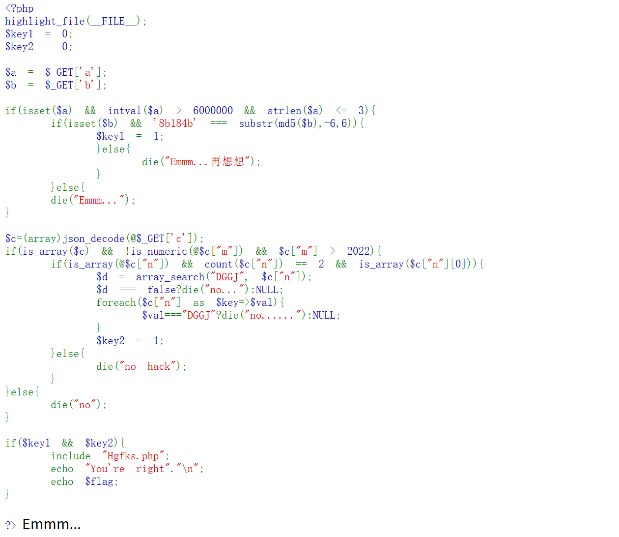 大概审完代码后我们知道只有当\(key1和\)key2均为1时才会包含Hgfks.php并输出flag,因此这是一道设计PHP弱类型比较、函数行为差异与逻辑矛盾点的题。