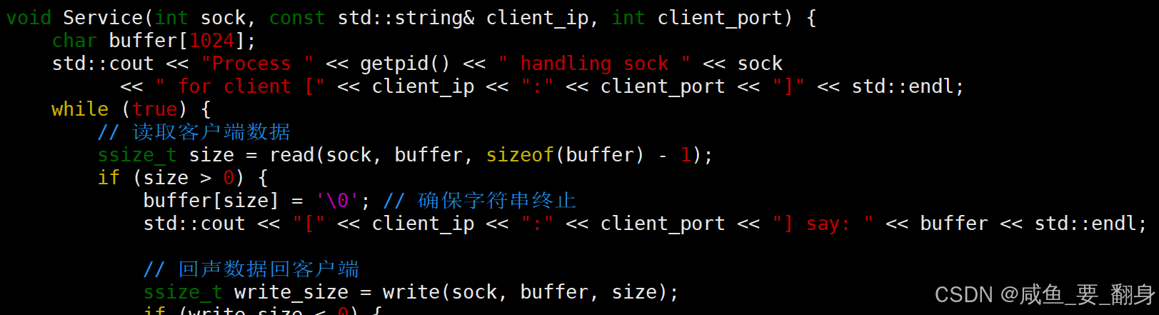 public:Handler(){}~Handler(){}void operator()(int sock, std::string client_ip, int client_port){char buffer[1024];while (true){ssize_t size = read(sock, buffer, sizeof(buffer)-1);if (size > 0){ //读取成功buffer[size] = '\0';std::cout << client_ip << ":" << client_port << "# " << buffer << std::endl;write(sock, buffer, size);}else if (size == 0){ //对端关闭连接std::cout << client_ip << ":" << client_port << " close!" << std::endl;break;}else{ //读取失败std::cerr << sock << " read error!" << std::endl;break;}}close(sock); //归还文件描述符std::cout << client_ip << ":" << client_port << " service done!" << std::endl;}