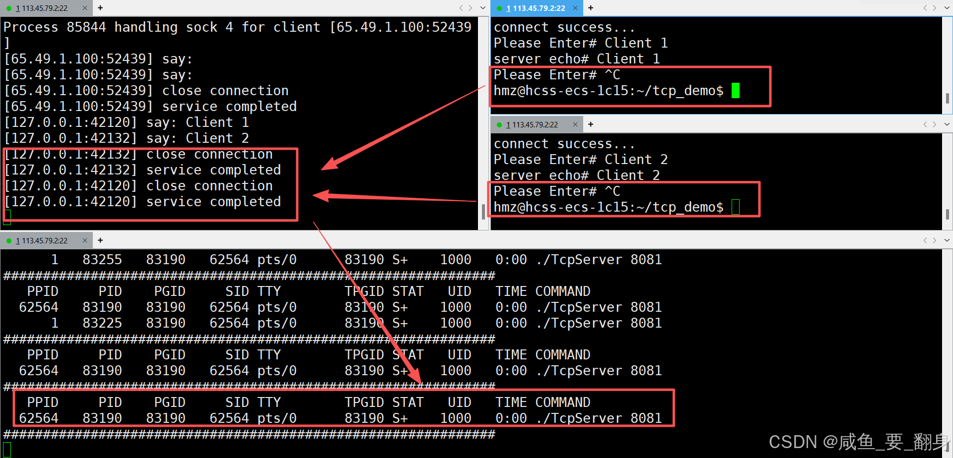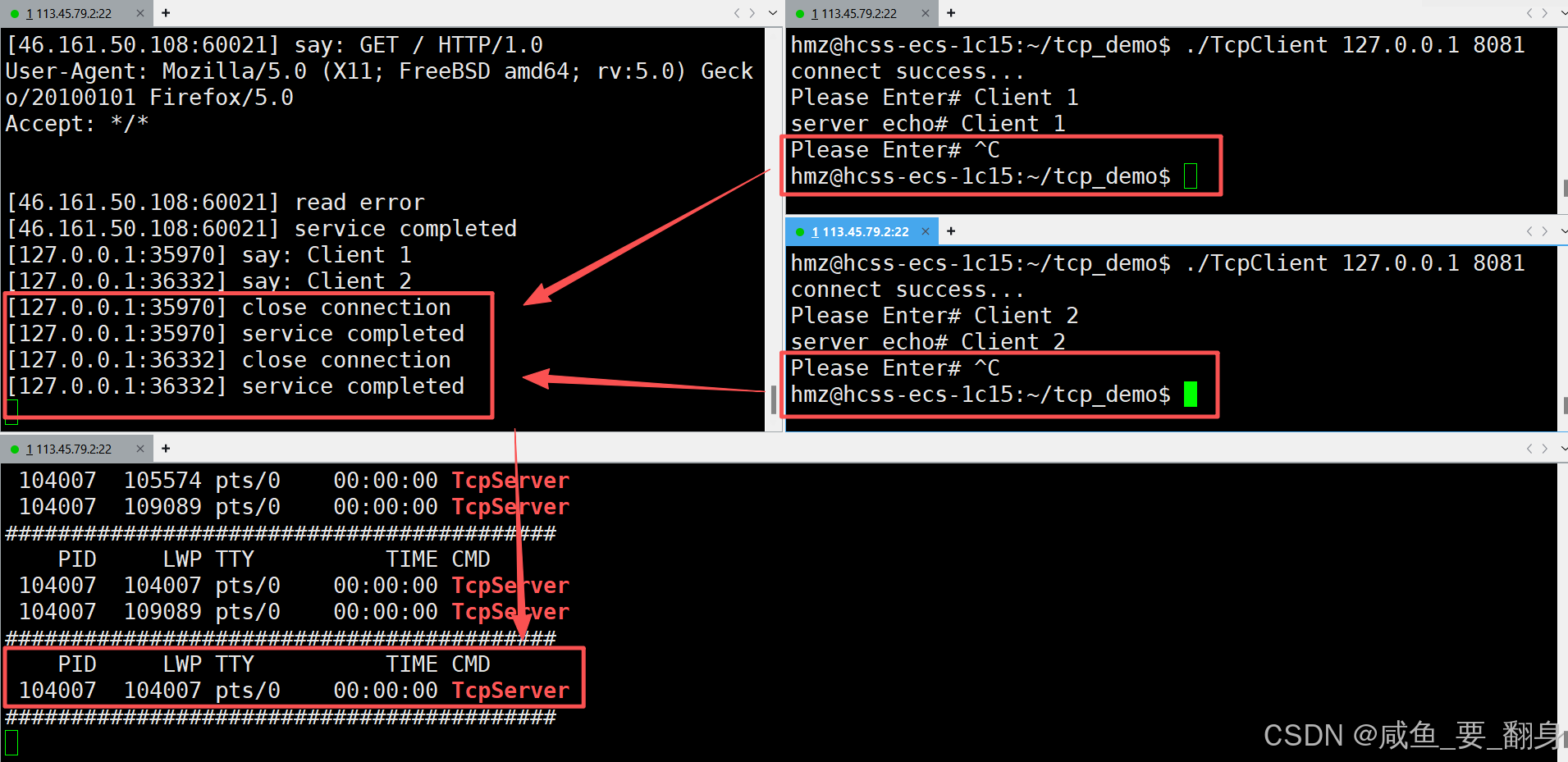 我们此时可以尝试关闭第一个客户端进程,然后我们可以看到服务端会等待第一个客户端断开连接后,才会处理并回显第二个客户端发送的数据: