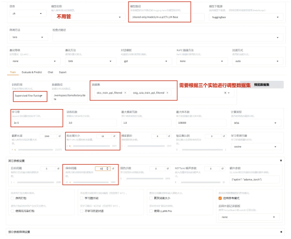 Train页面中,为了保证实验可比性,本次三组微调实验使用完全一致的训练参数,只更换数据集组合以验证不同中英配比的影响。下图中未展示的参数均使用默认。