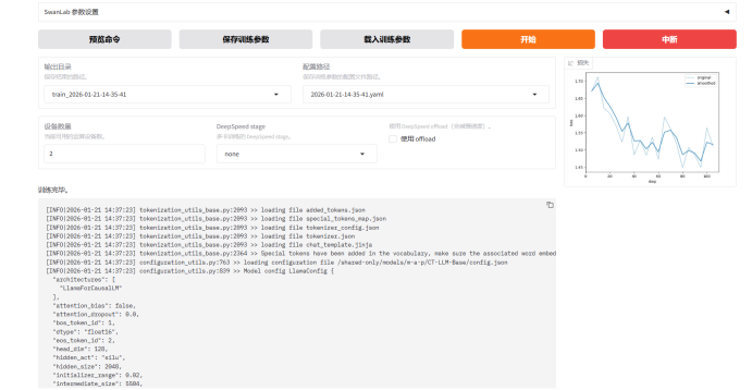 实验中设置三种数据配比方案(全中文 / 中英 2:1 / 中英 4:1),在 Web UI 中对应的数据集选择,参数配置完成后,点击开始启动任务。