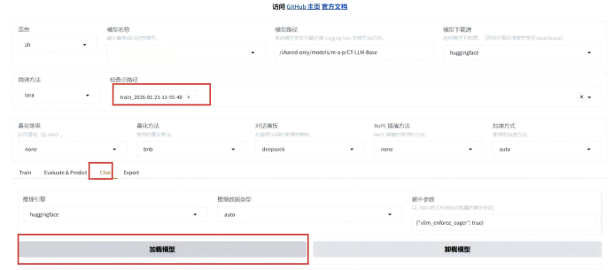 微调完成后,切换到 “Chat” 页面进行定性验证。评测原模型时,先清空 “检查点路径”,再点击 “加载模型”,确保对话调用的是基础模型本体;随后在输入框中填写同一个测试问题,点击提交并观察模型回答。
