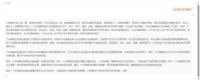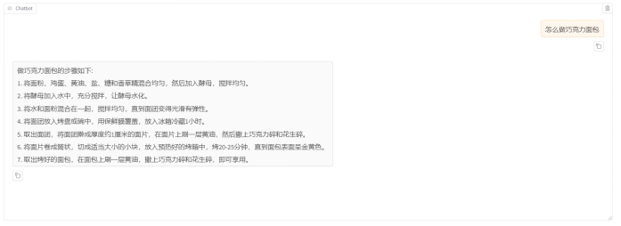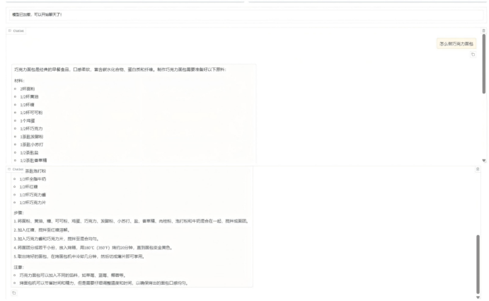 可见,原模型回答主题并不明确,微调后回答更具准确性,围绕”制作巧克力面包“展开。